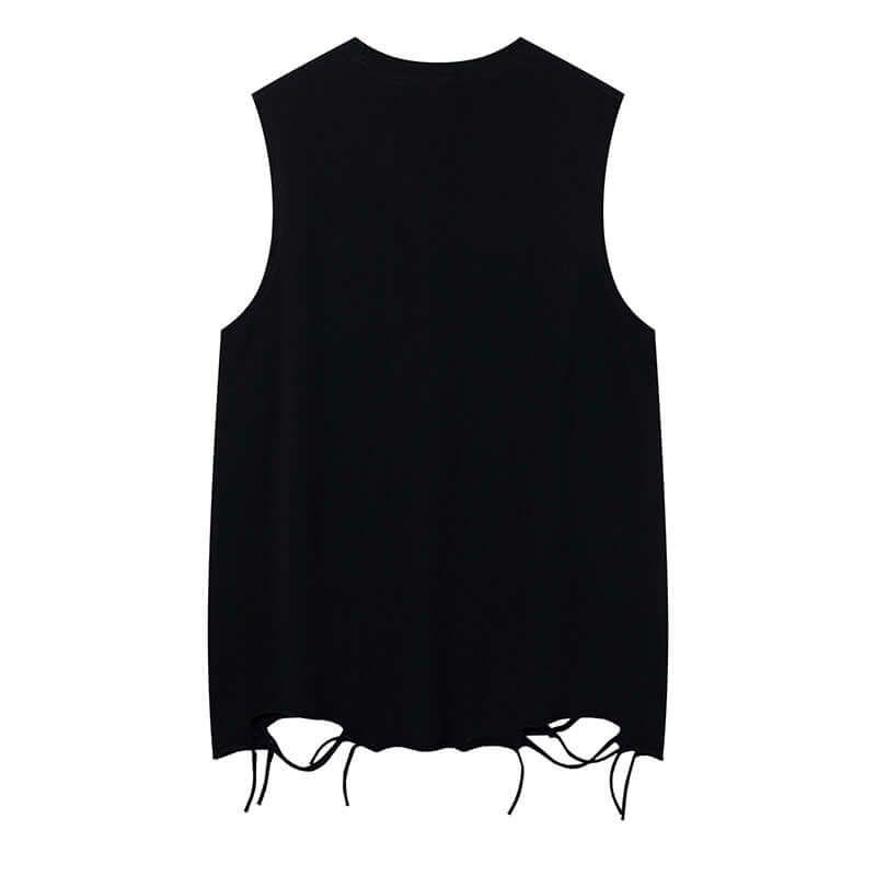 • Back view of Smiley Graffiti Print Sleeveless Tank Top featuring slashed hole detailing and relaxed fit.
