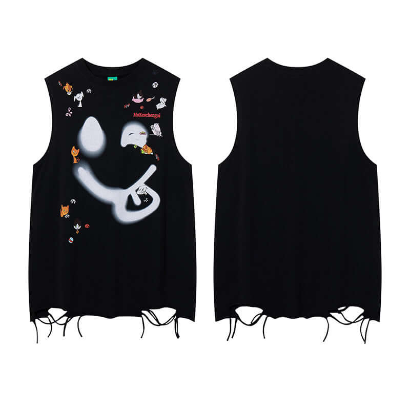 • Smiley Graffiti Print Sleeveless Tank Top featuring bold graffiti design and slashed hole detailing on a black background.