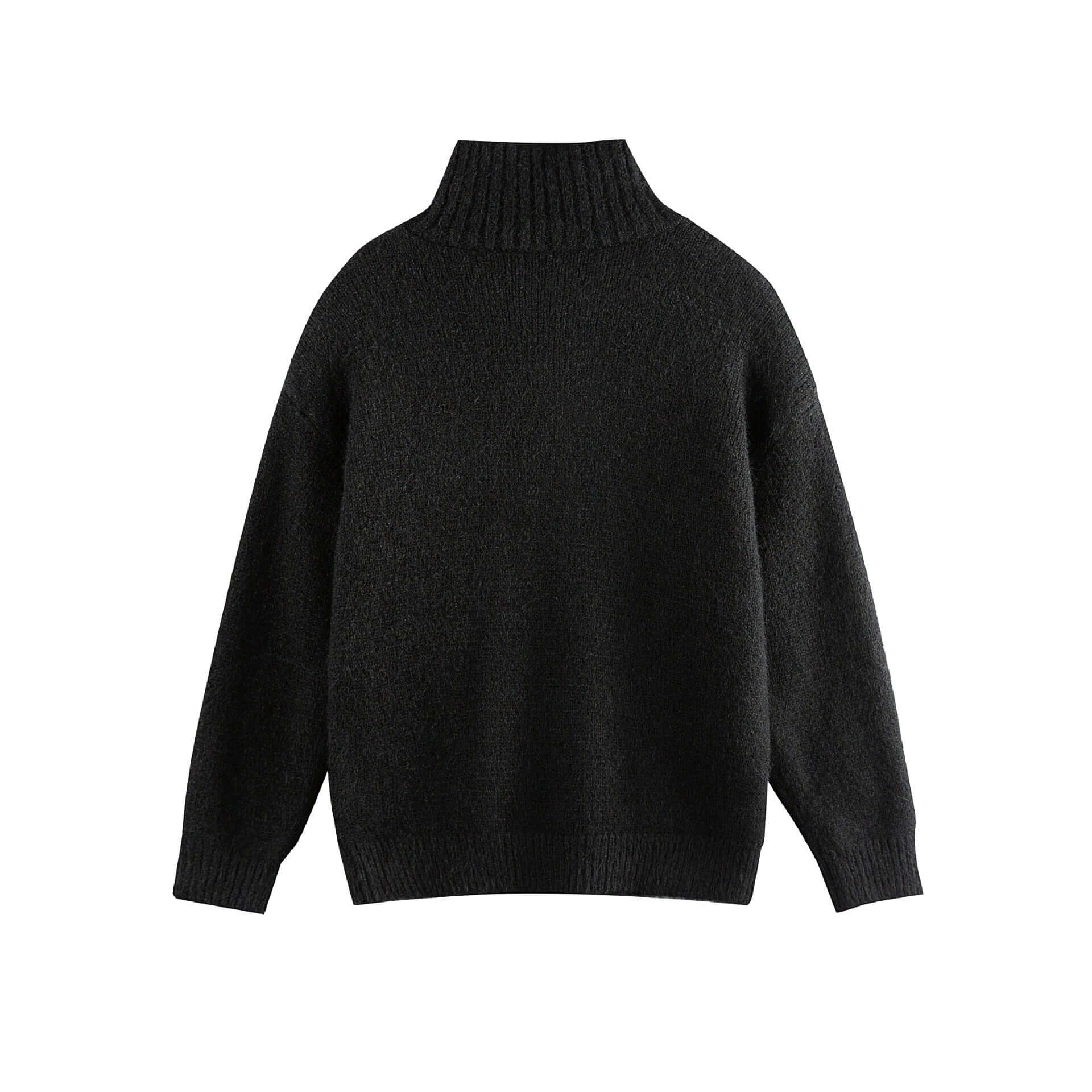 • Stand Collar Pullover Sweater - Loose Fit in black, featuring a high-neck stand collar and relaxed fit, showcasing its clean design.