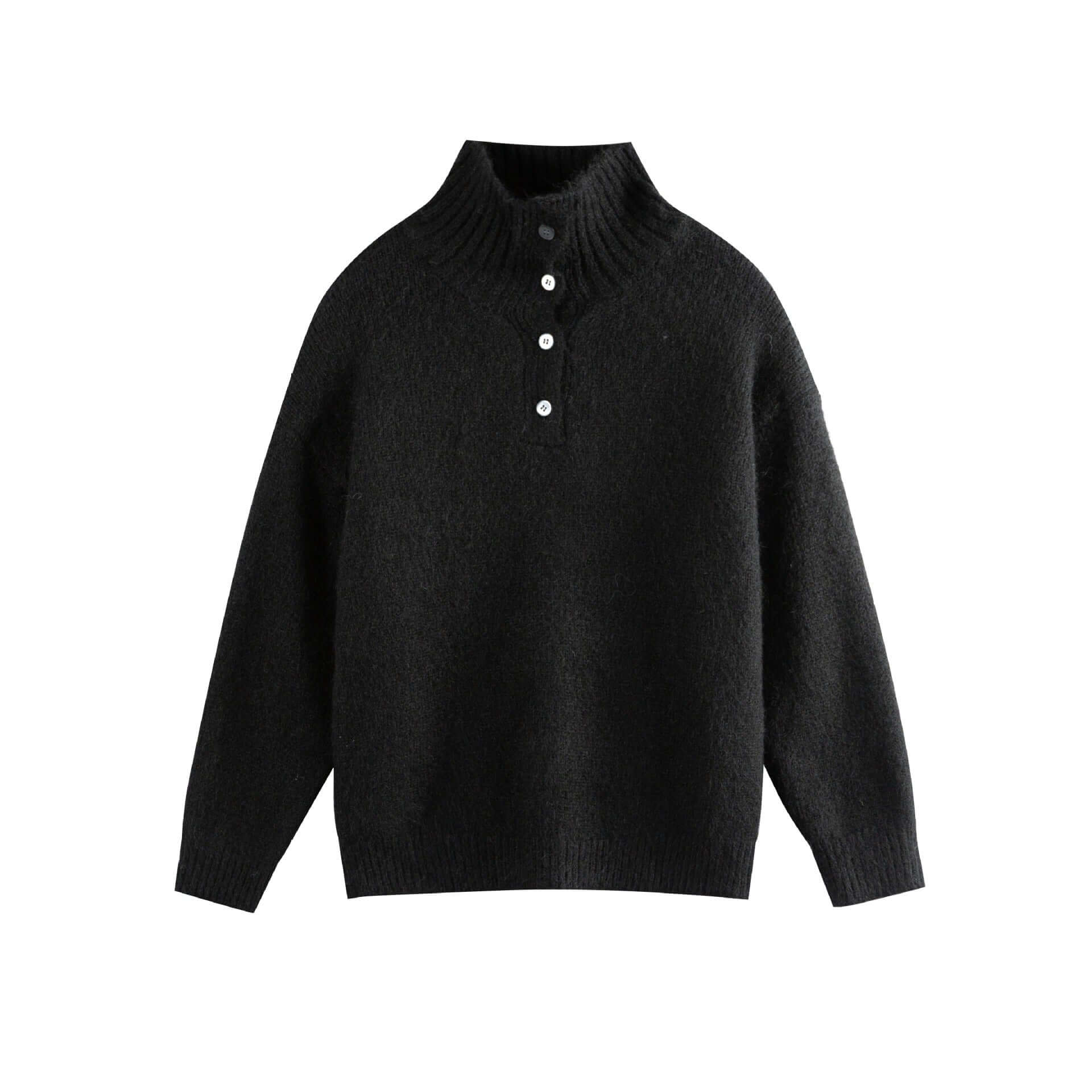 • Stand Collar Pullover Sweater - Loose Fit in black, featuring a buttoned high-neck design and relaxed fit.