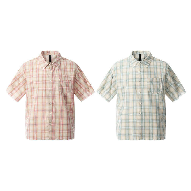 • Frayed Hem Checkered Shirt - Loose Fit in pink and blue checkered patterns, casual summer style for men and women.
